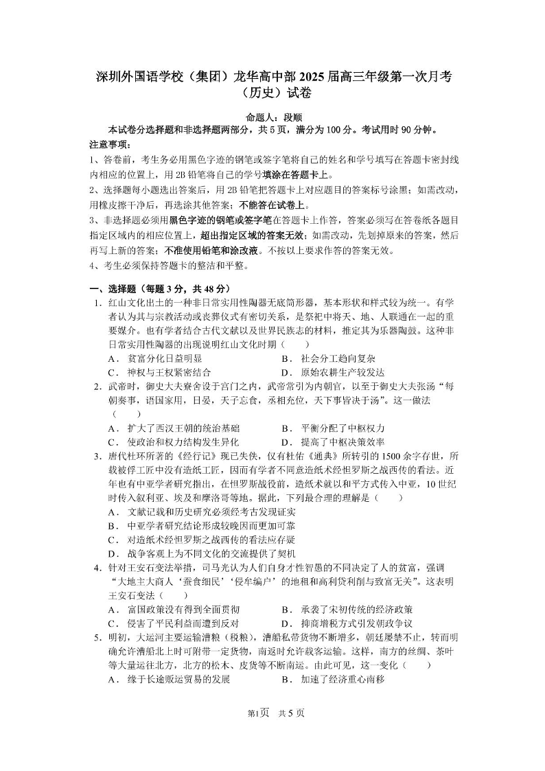 广东省深圳外国语学校(集团)龙华高中部2024-2025学年高三上学期第一次月考+历史