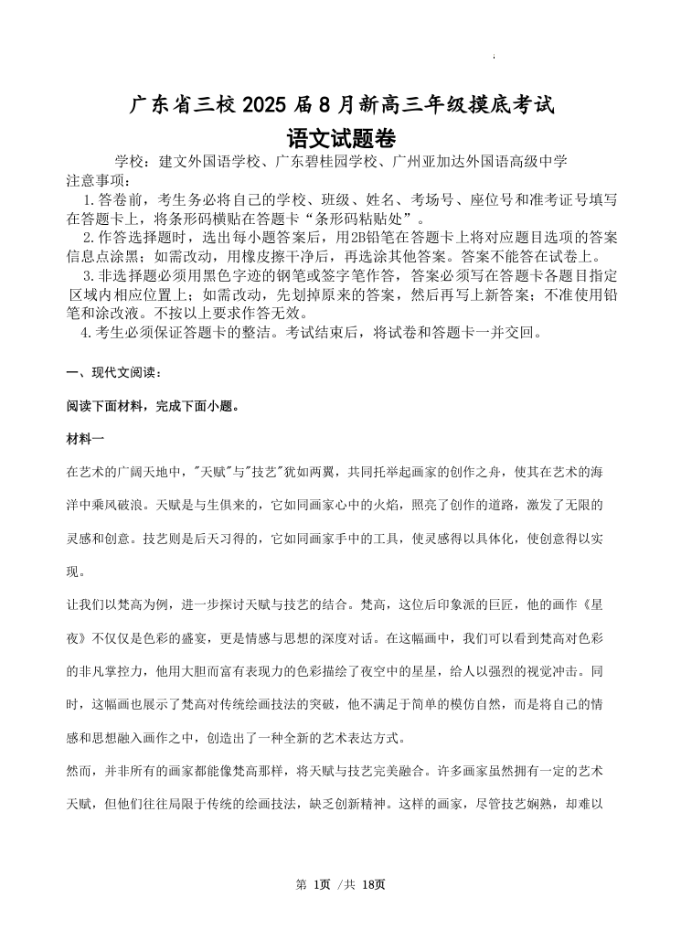 广东省三校2024-2025学年高三上学期开学考试+语文