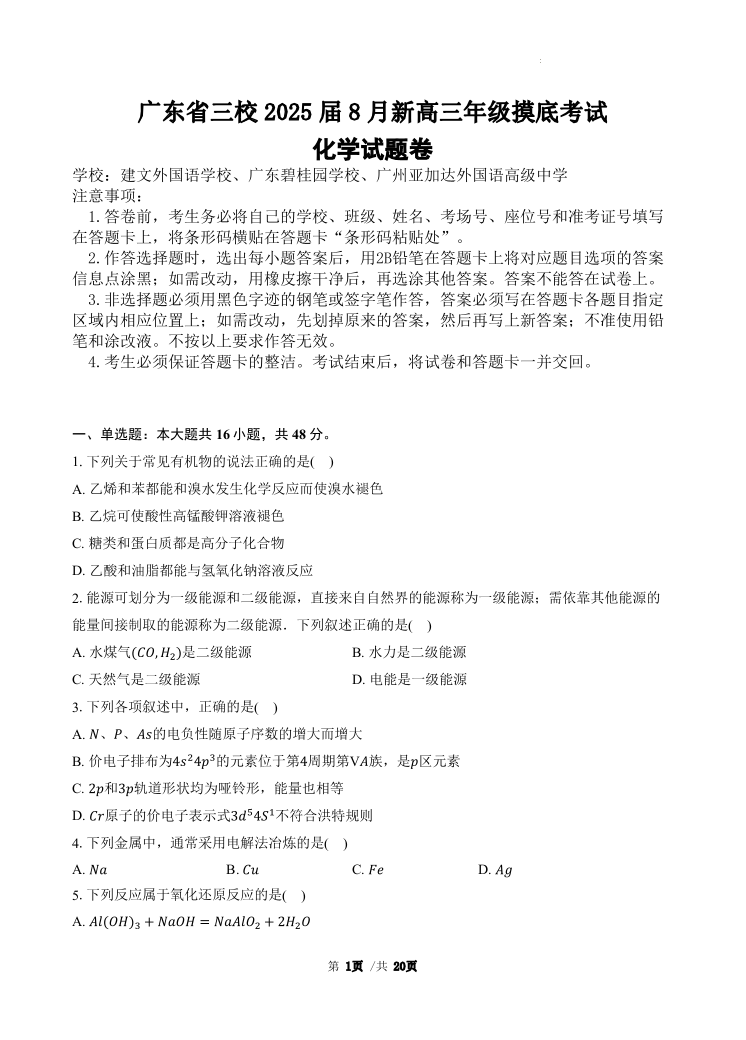 广东省三校2024-2025学年高三上学期开学考试+化学