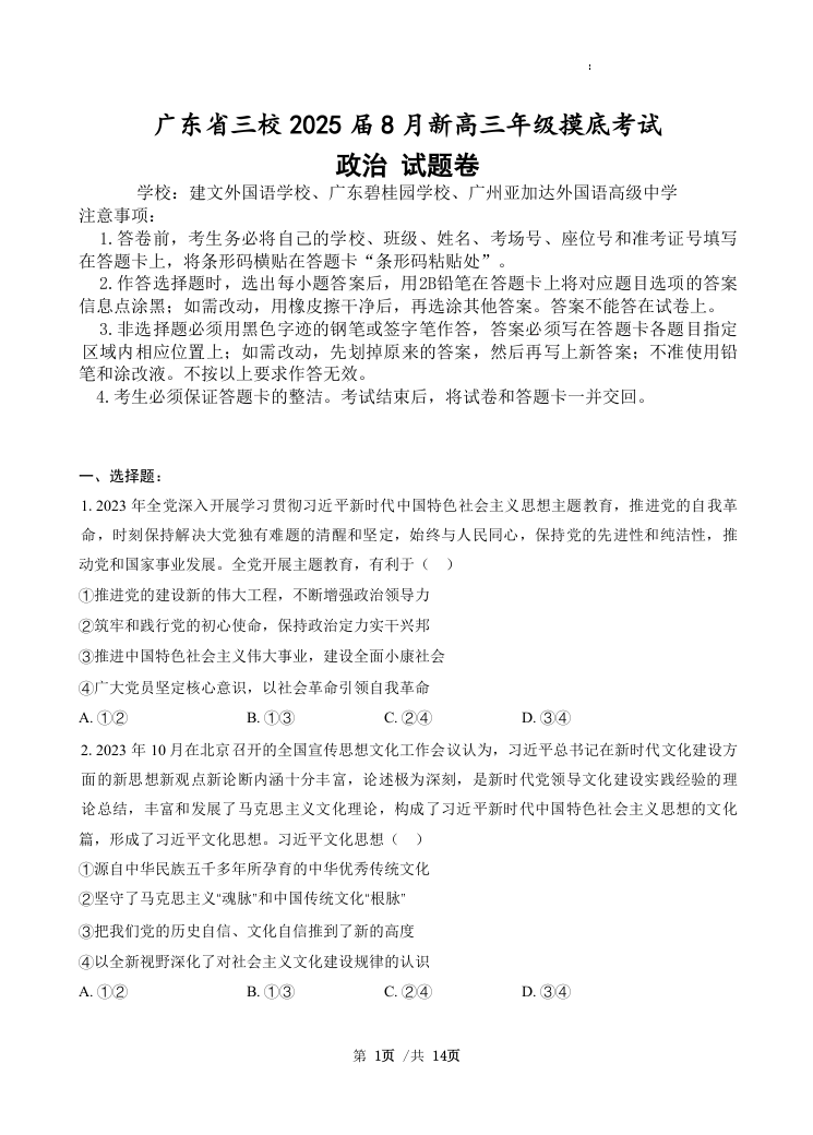 广东省三校2024-2025学年高三上学期开学考试+政治