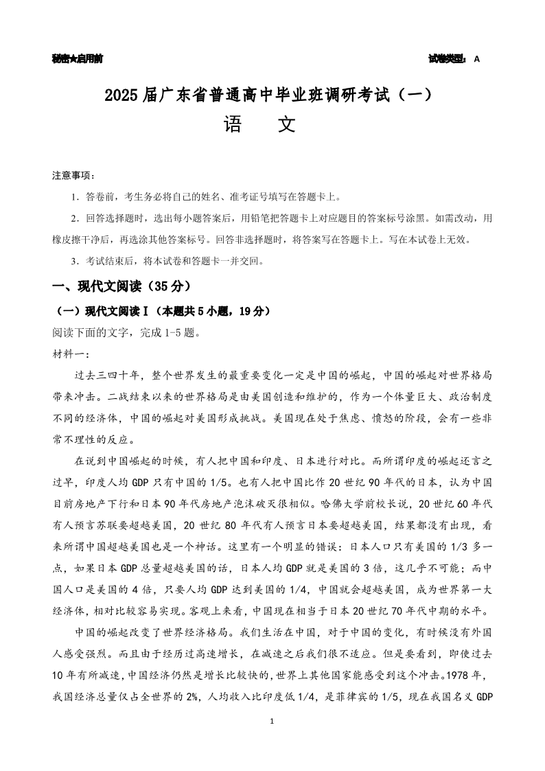 广东省高考研究会:2025届广东省普通高中毕业班调研考试(一)语文
