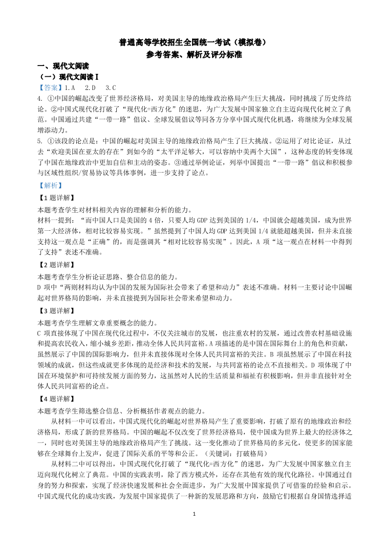 广东省高考研究会:2025届广东省普通高中毕业班调研考试(一)语文答案