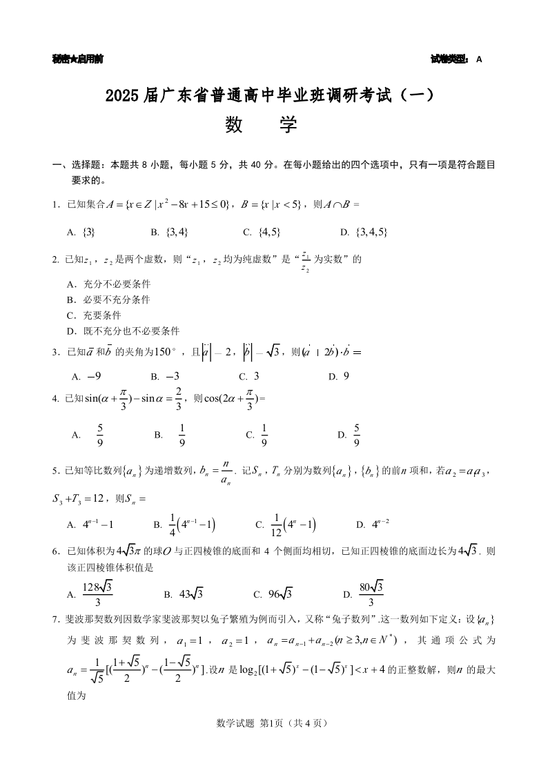 广东省高考研究会:2025届广东省普通高中毕业班调研考试(一)数学