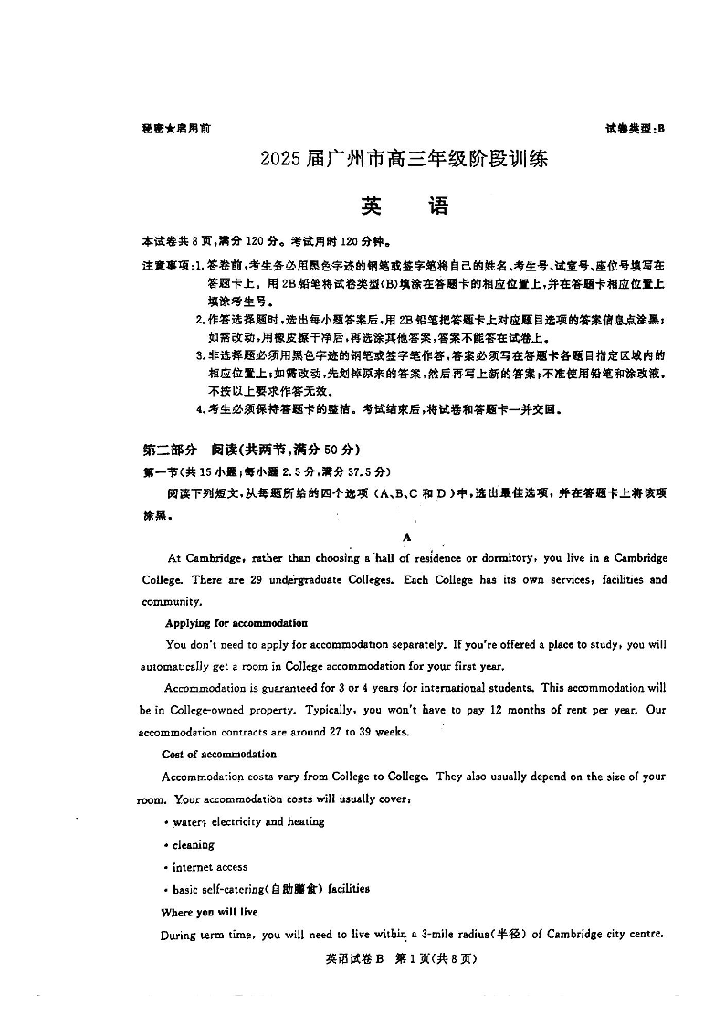 广东省2025届广州市高三年级阶段训练暨8月摸底考试(市调研考)英语