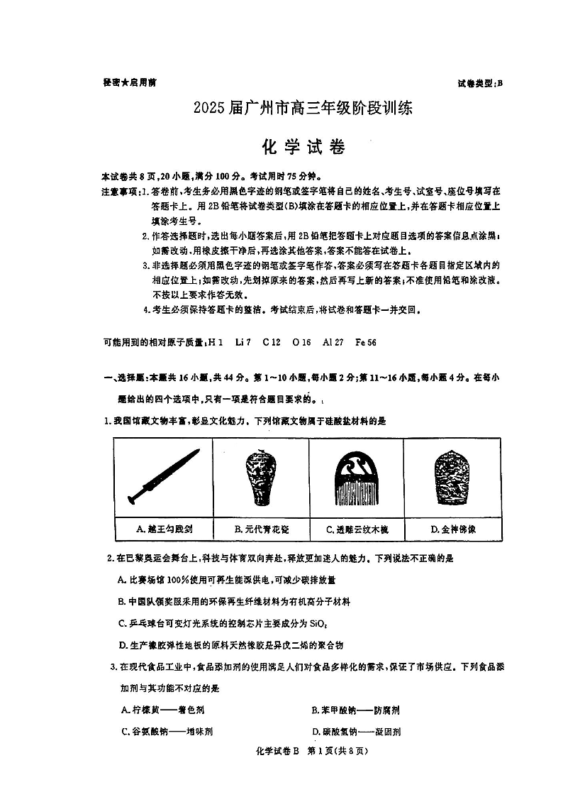 广东省2025届广州市高三年级阶段训练暨8月摸底考试(市调研考)化学
