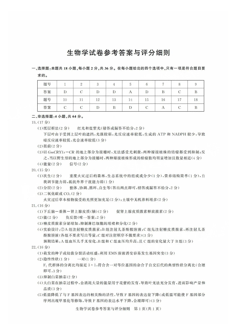 广东省2025届广州市高三年级阶段训练暨8月摸底考试(市调研考)生物答案