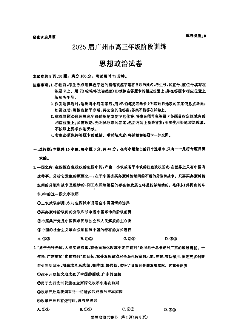 广东省2025届广州市高三年级阶段训练暨8月摸底考试(市调研考)政治