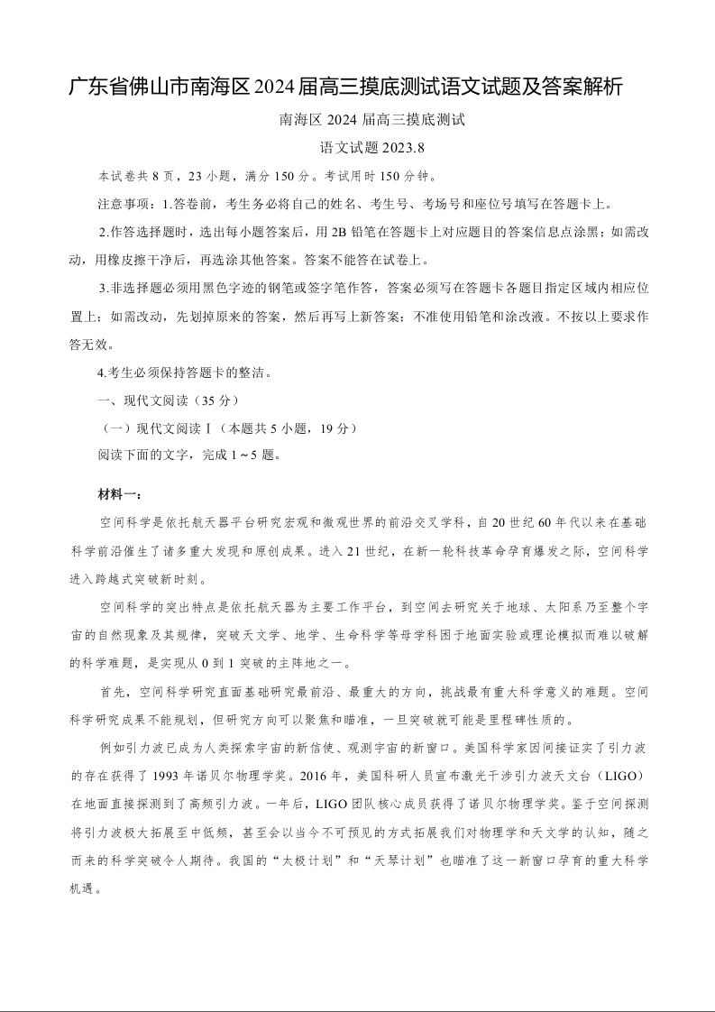 广东省佛山市南海区2024-2025学年高三上学期开学摸底测试+语文