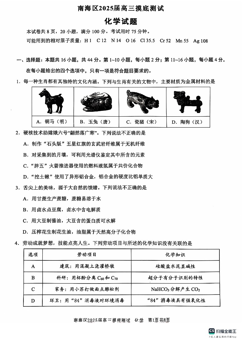 广东省佛山市南海区2024-2025学年高三上学期开学摸底测试+化学