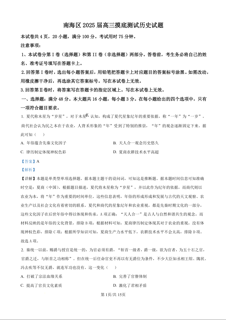 广东省佛山市南海区2024-2025学年高三上学期开学摸底测试+历史