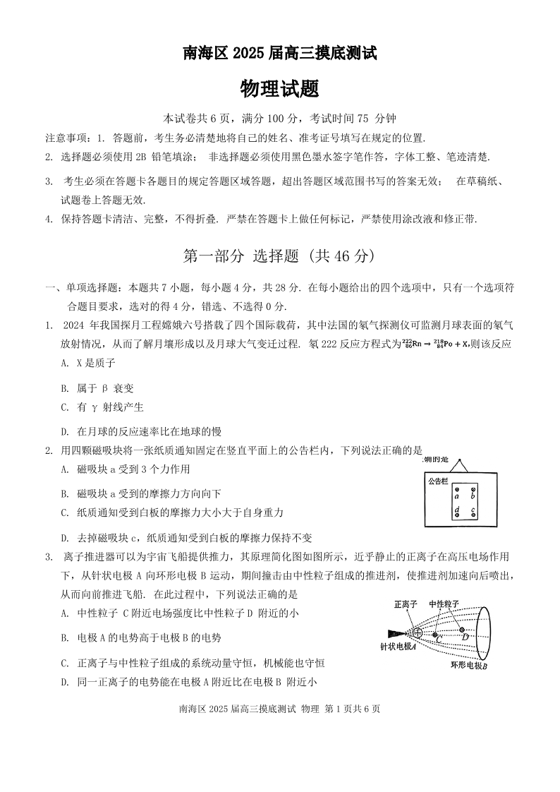广东省佛山市南海区2024-2025学年高三上学期开学摸底测试+物理