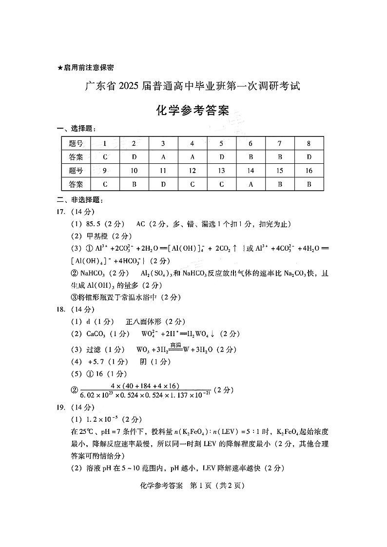 广东省2024-2025学年高三上学期毕业班第一次调研考试+化学答案