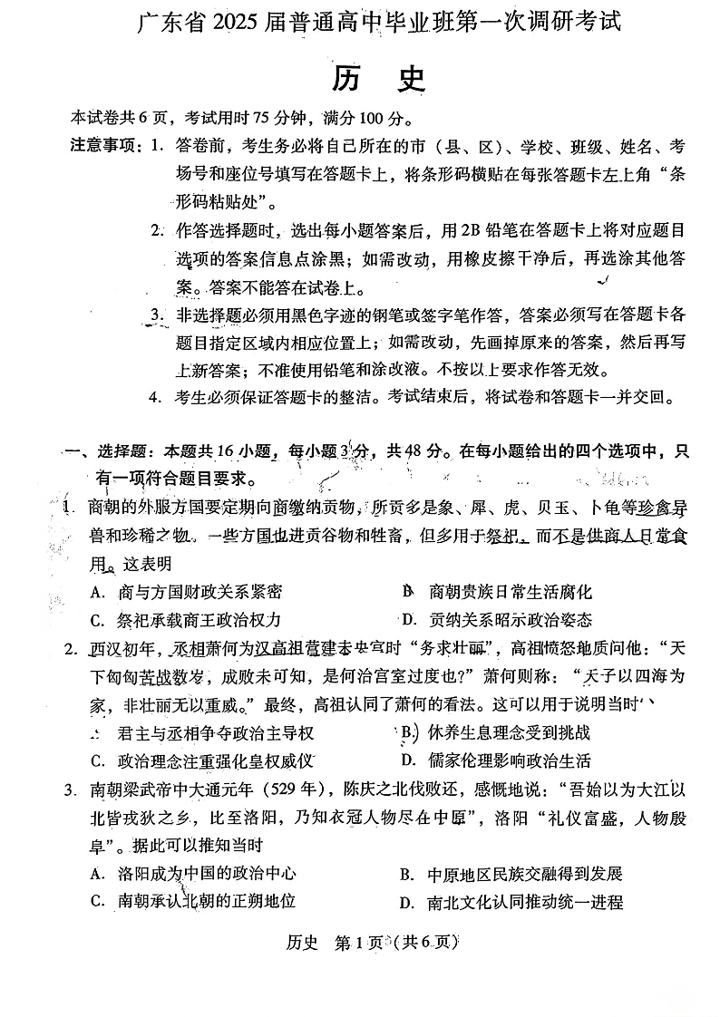 广东省2024-2025学年高三上学期毕业班第一次调研考试+历史