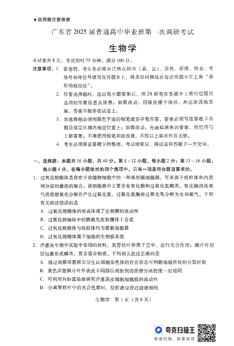 广东省2024-2025学年高三上学期毕业班第一次调研考试+生物