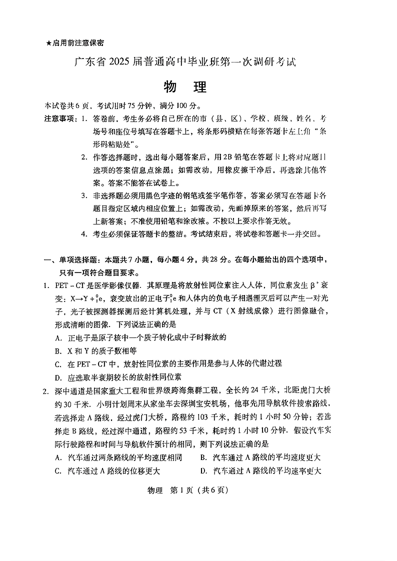 广东省2024-2025学年高三上学期毕业班第一次调研考试+物理