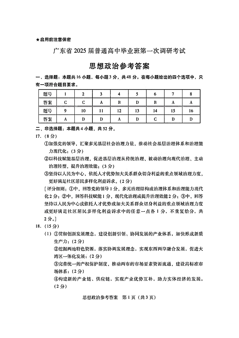 广东省2024-2025学年高三上学期毕业班第一次调研考试+政治答案