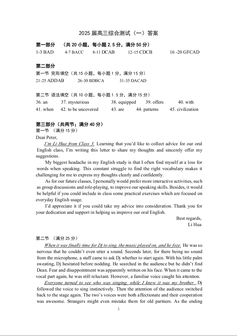 广东省华南师范大学附属中学2025届高三综合测试(一)英语答案