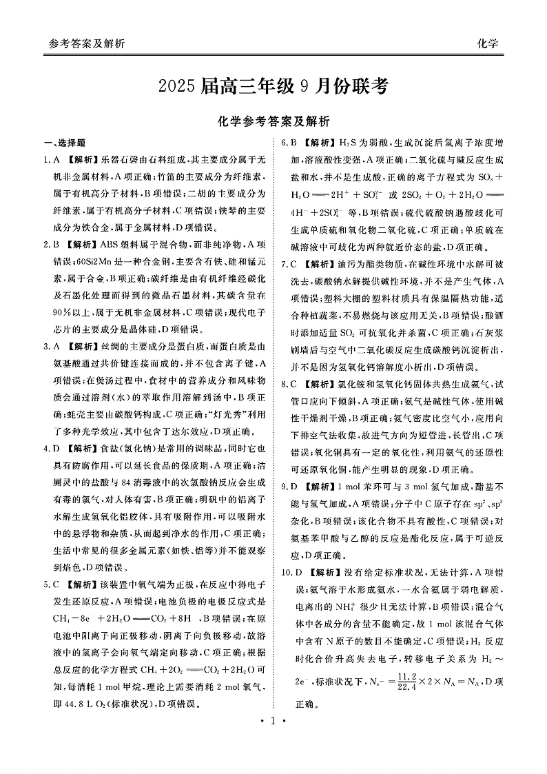 广东省2025届高三年级衡水9月份大联考+化学答案