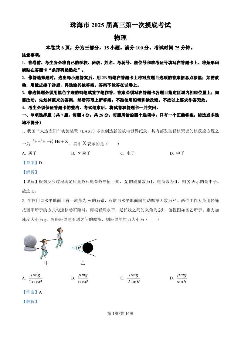 广东省珠海市2024-2025学年高三上学期第一次摸底考试+物理答案