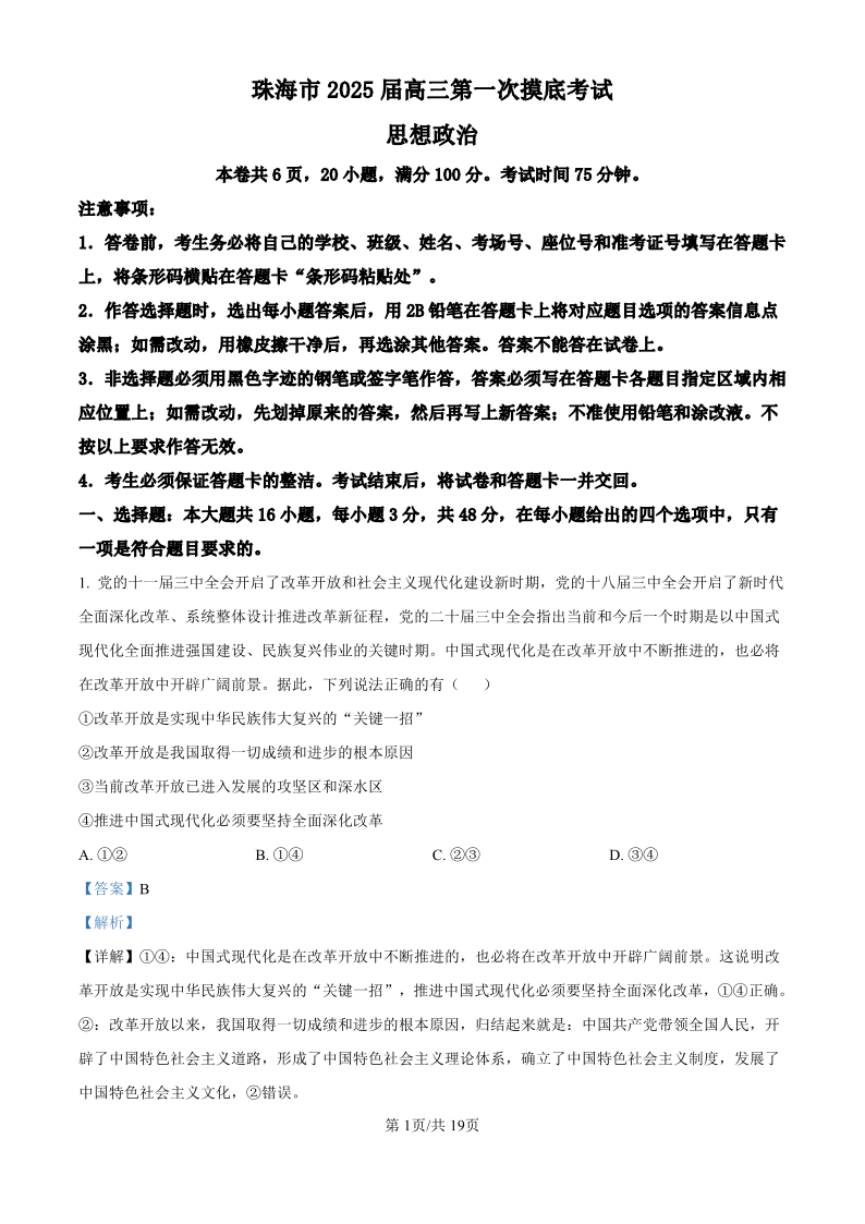 广东省珠海市2024-2025学年高三上学期第一次摸底考试+政治答案