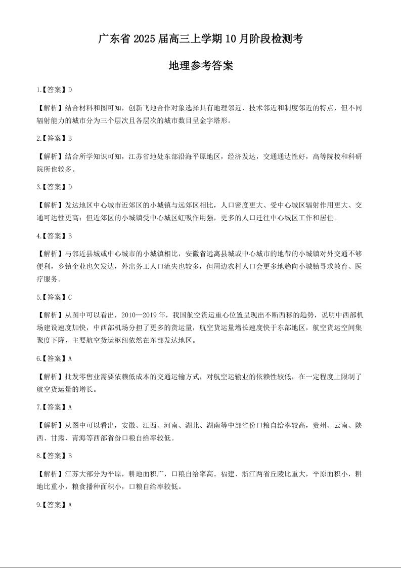 广东省2025届高三上学期10月阶段检测考+地理答案