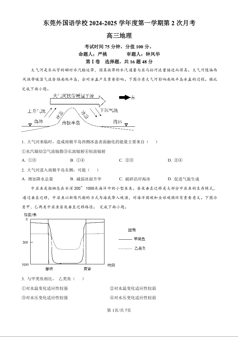 广东省东莞市东莞外国语学校2025届高三上学期10月月考+地理