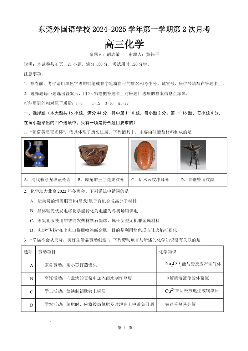广东省东莞市东莞外国语学校2025届高三上学期10月月考+化学