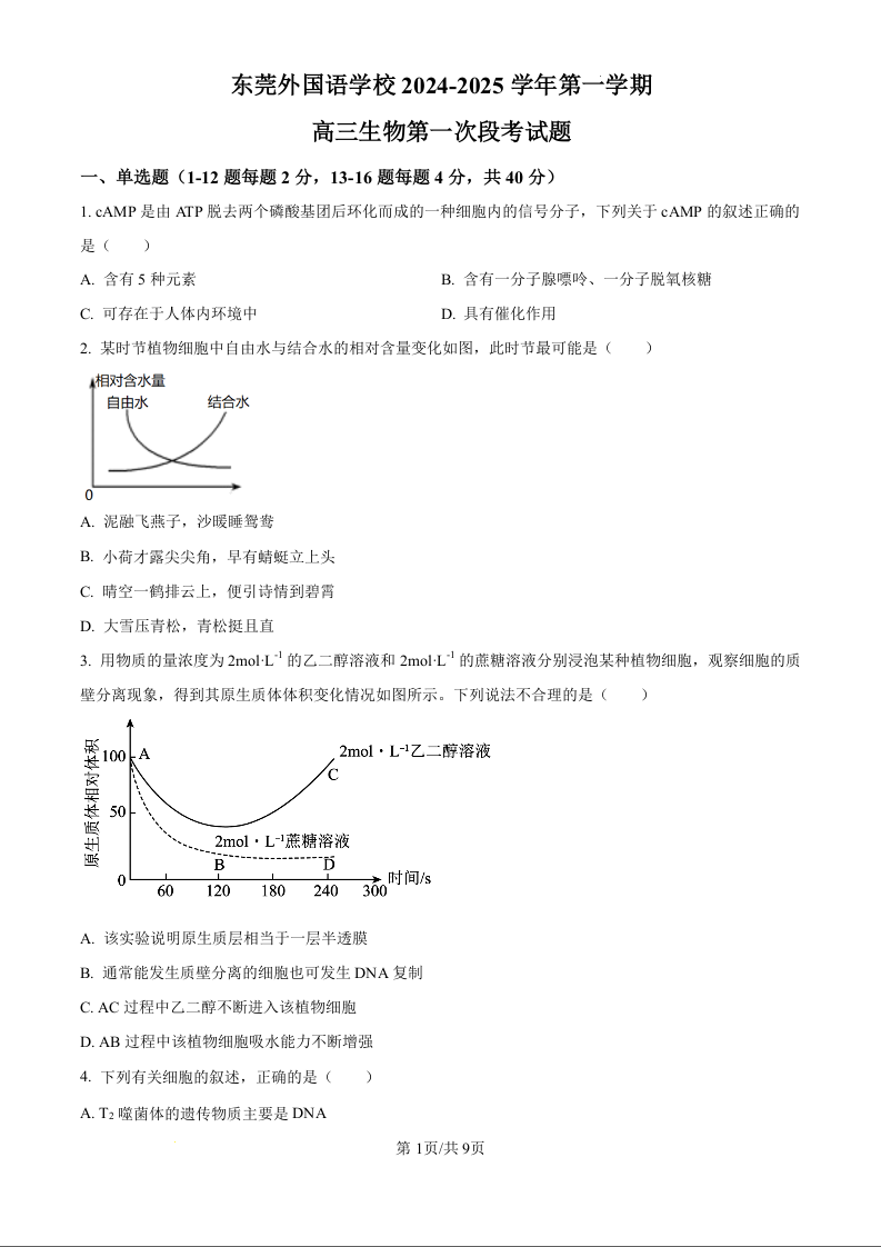 广东省东莞市东莞外国语学校2025届高三上学期10月月考+生物