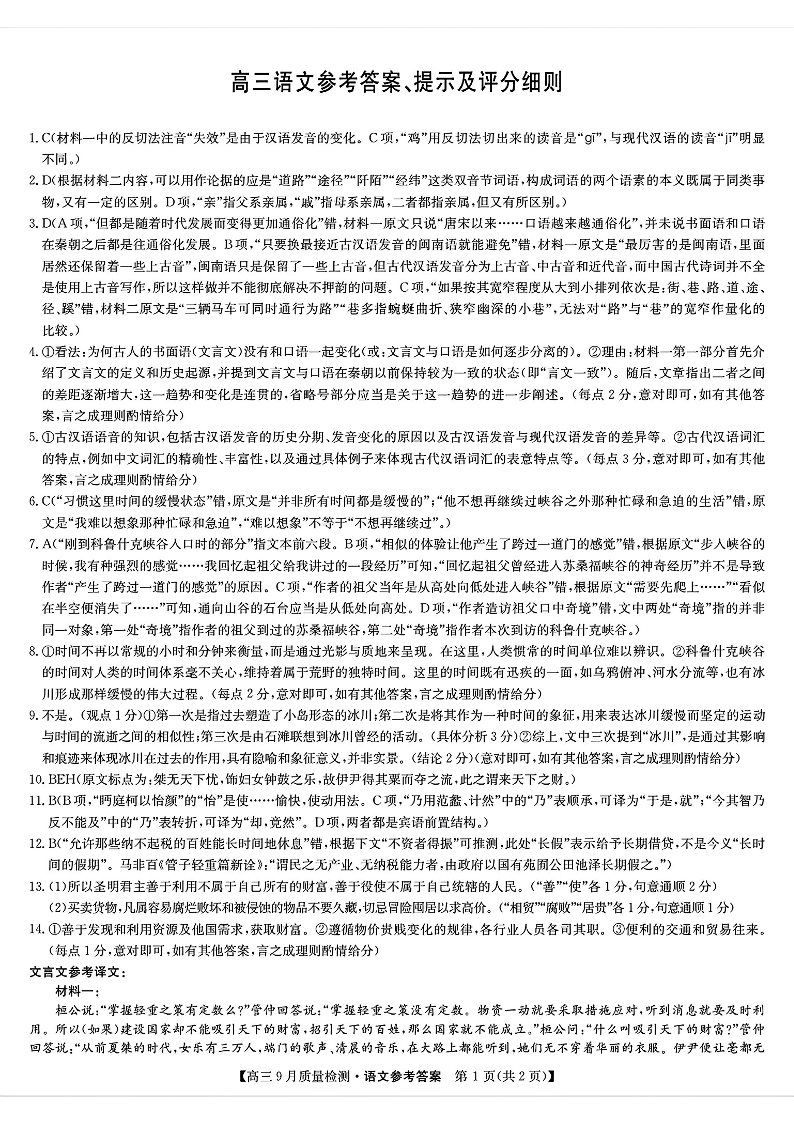 九师联盟2025届高三9月质量检测+语文答案