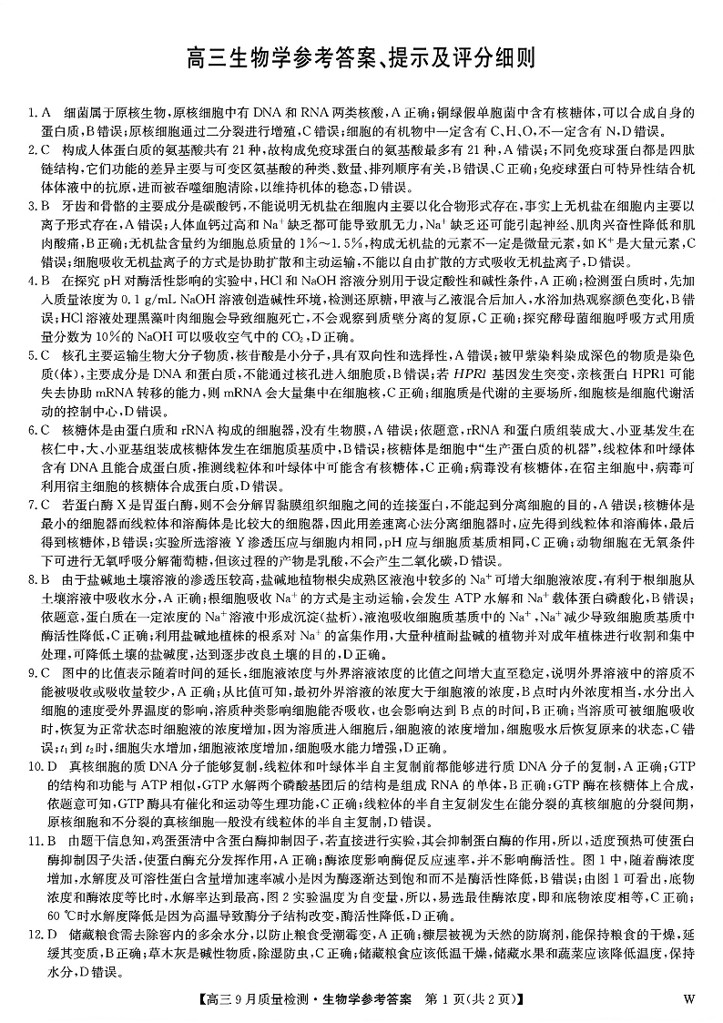 九师联盟2025届高三9月质量检测+生物答案