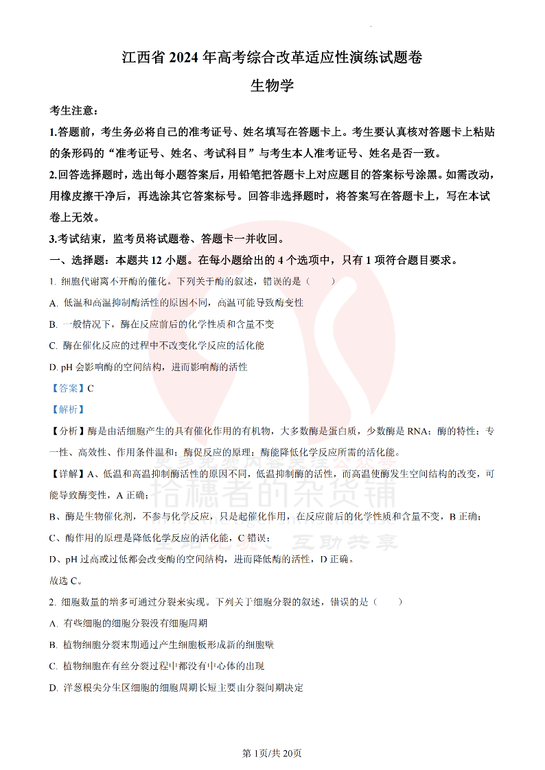 2024年1月江西省普通高等学校招生全国统一考试适应性测试(九省联考)生物试题(解析版)