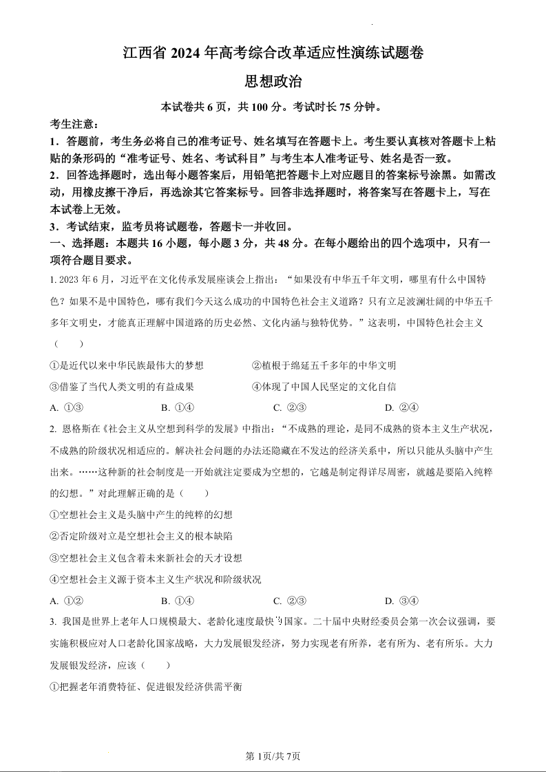 2024年1月普通高等学校招生考试适应性测试政治试题(适用地区:江西)(原卷版)