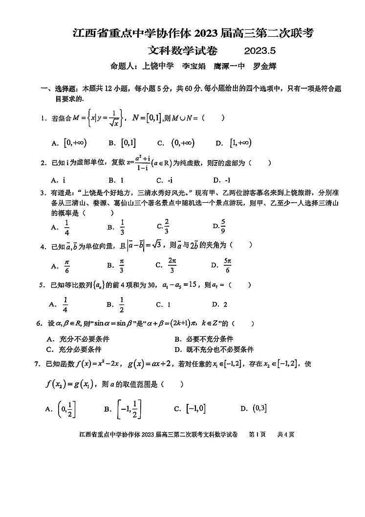 江西省重点中学协作体2023届高三第二次联考 文科数学