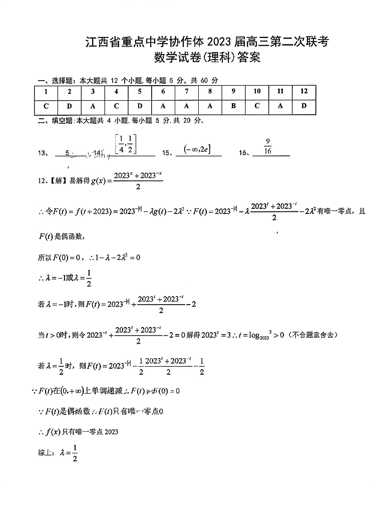 江西省重点中学协作体2023届高三第二次联考 理科数学答案