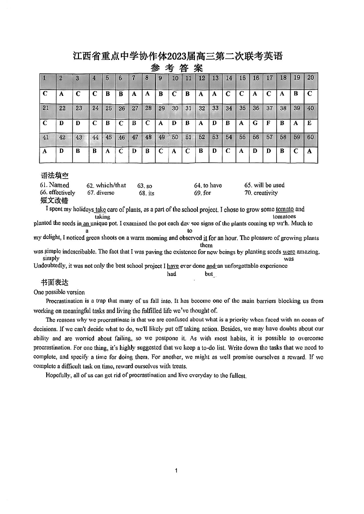 江西省重点中学协作体2023届高三第二次联考 英语答案
