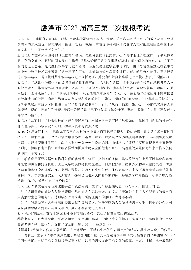 鹰潭市2023届高三第二次模拟考试 语文答案