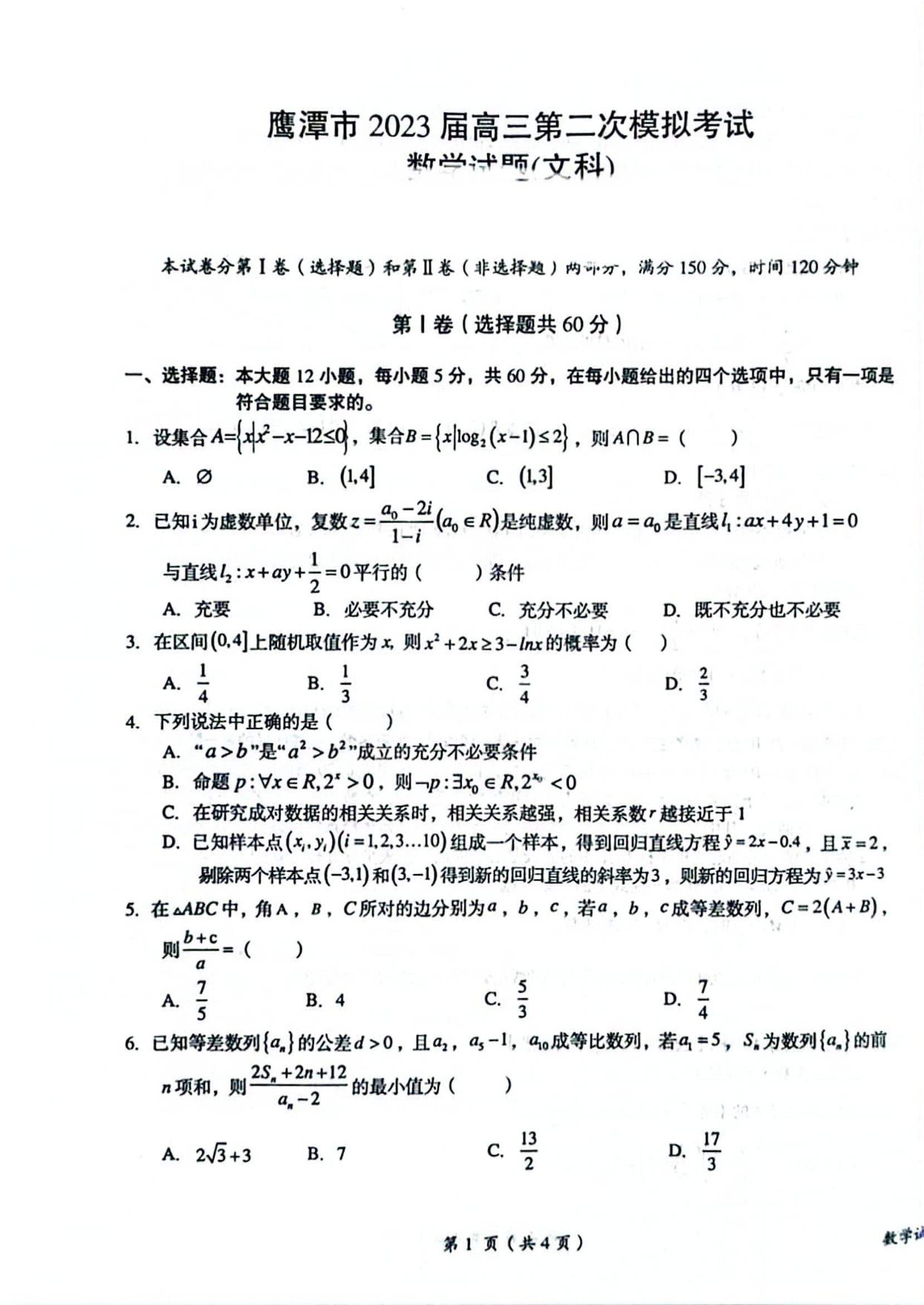 鹰潭市2023届高三第二次模拟考试 文数