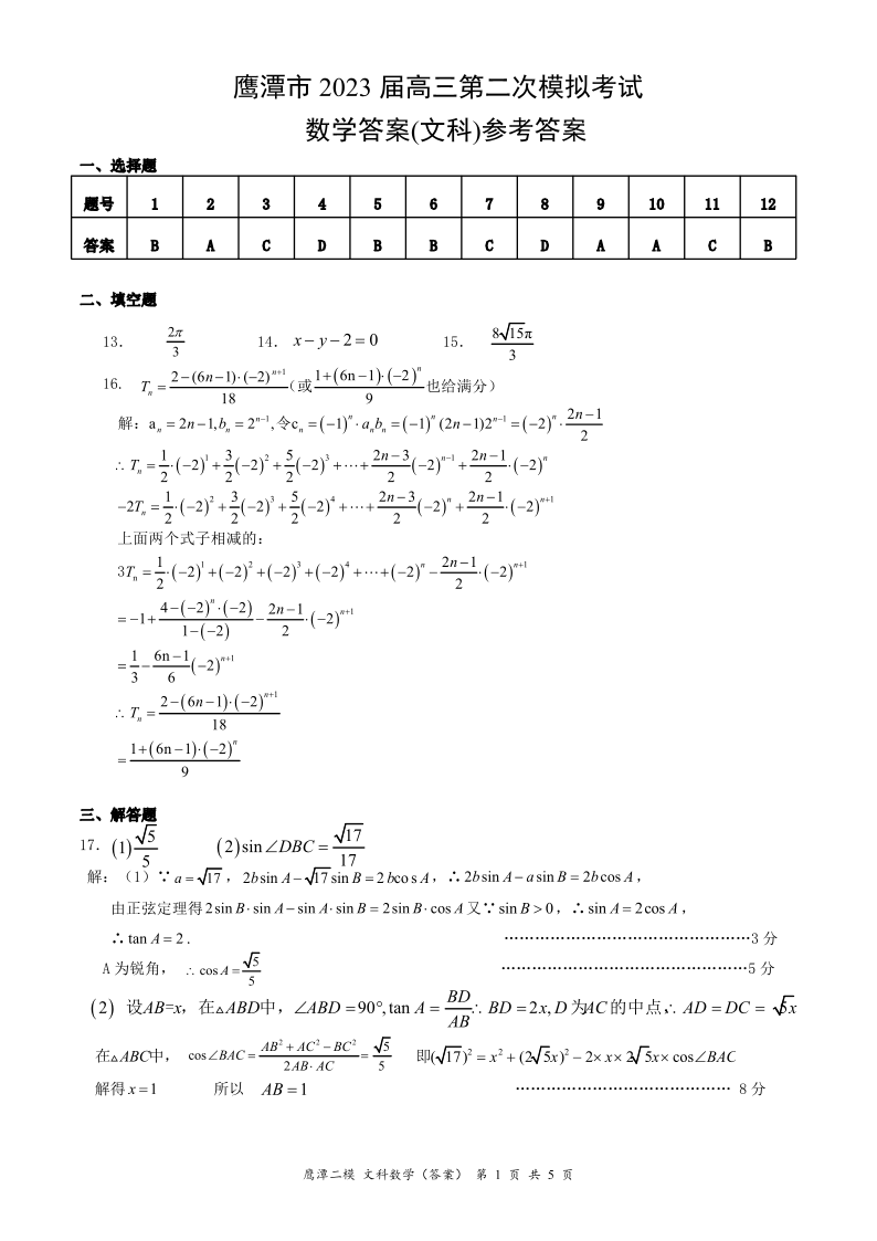 鹰潭市2023届高三第二次模拟考试 文数答案