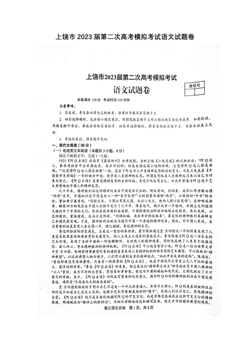 上饶市2023届第二次高考模拟考试 语文