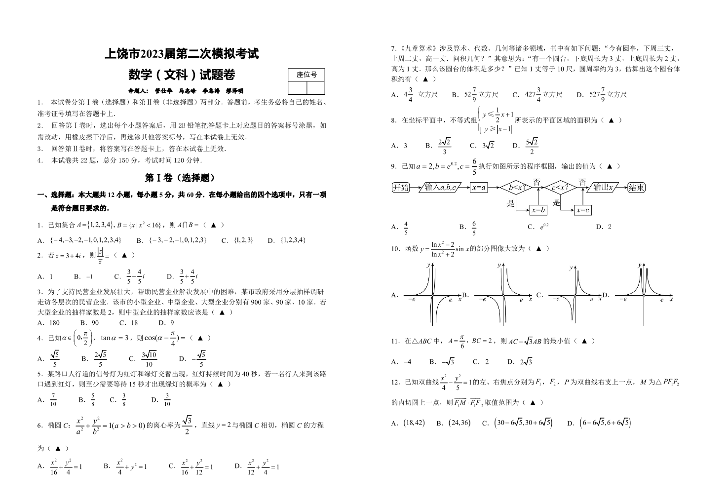 上饶市2023届第二次高考模拟考试 数学(文科)