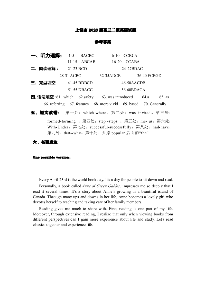 上饶市2023届第二次高考模拟考试 英语答案