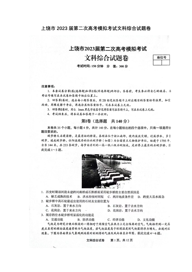 上饶市2023届第二次高考模拟考试 文综
