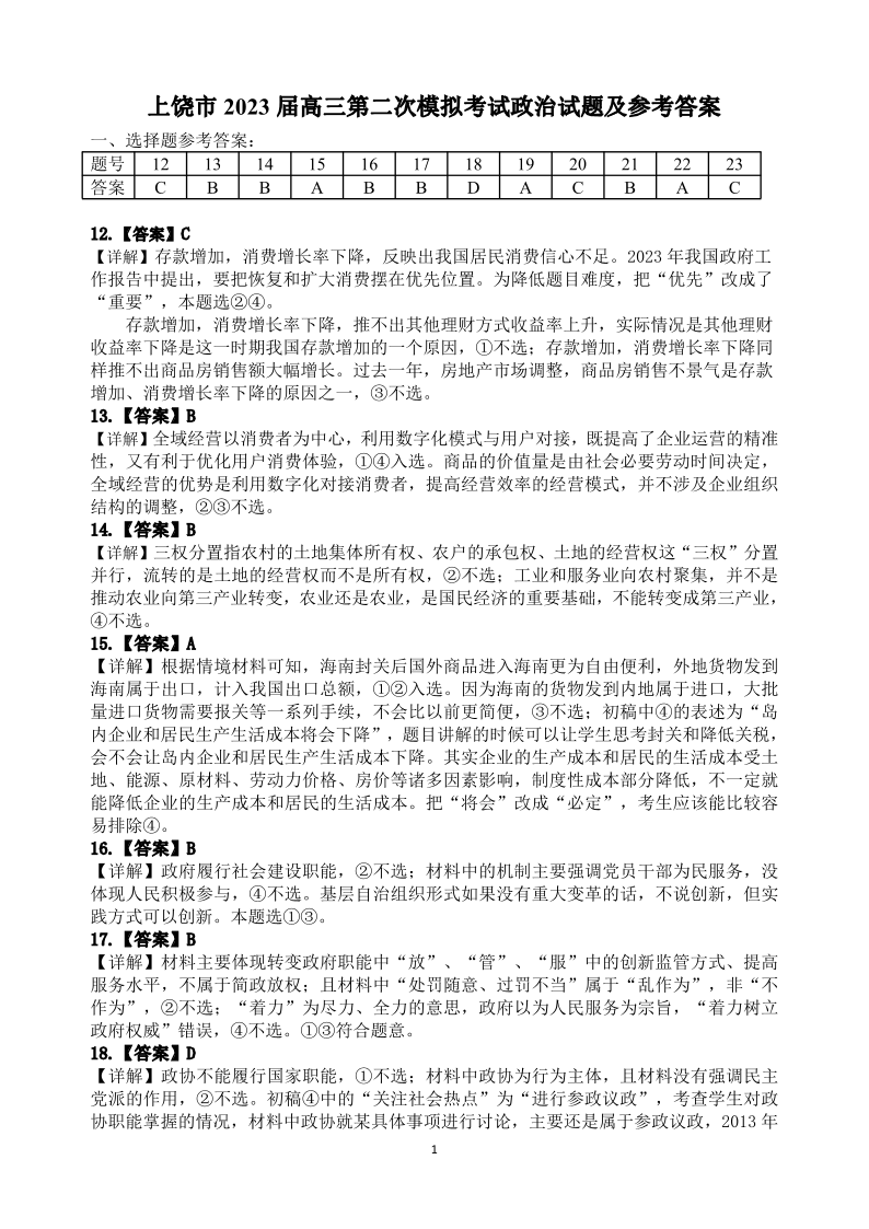 上饶市2023届第二次高考模拟考试 文综政治答案