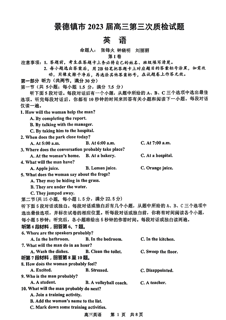景德镇市2023届高三第三次质量检测 英语