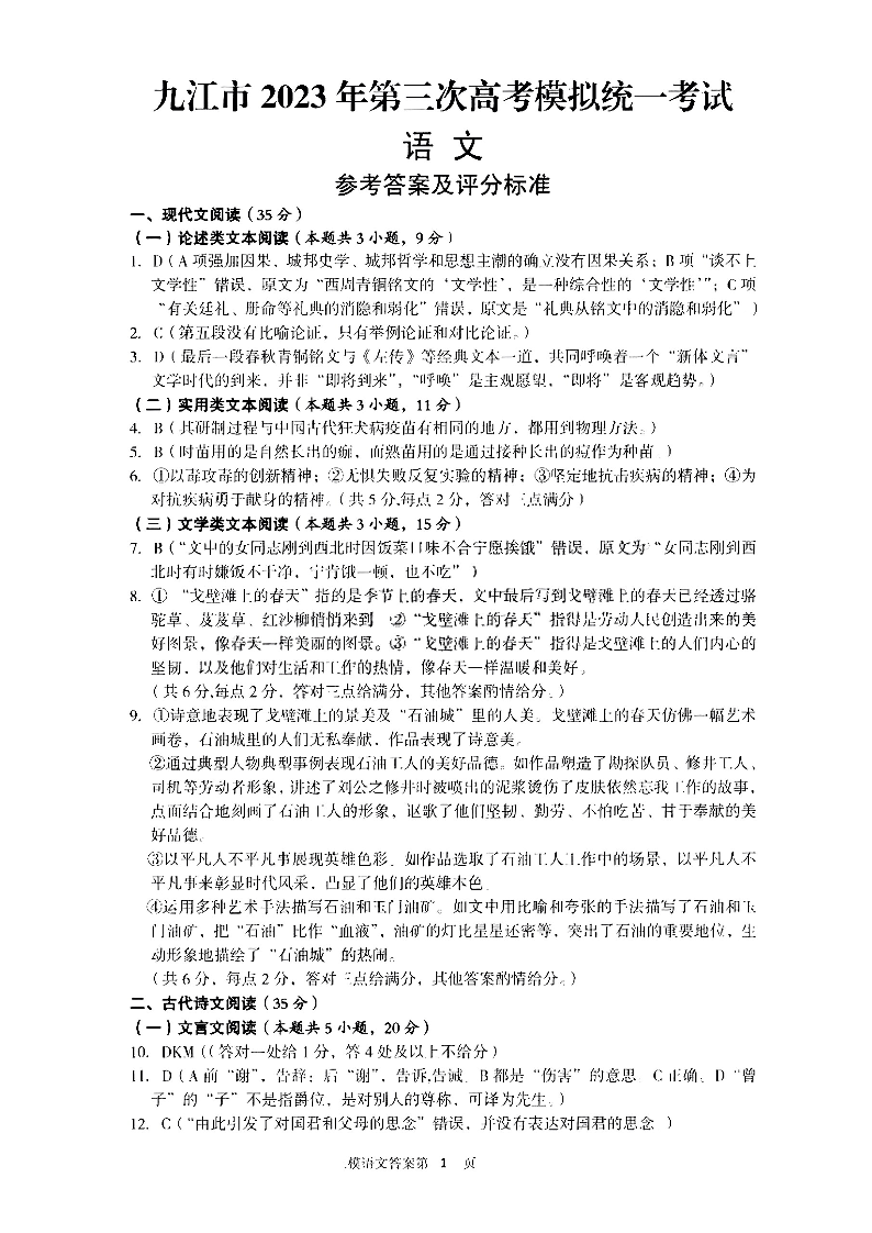 2023届江西省九江市高三第三次模拟考试 语文答案