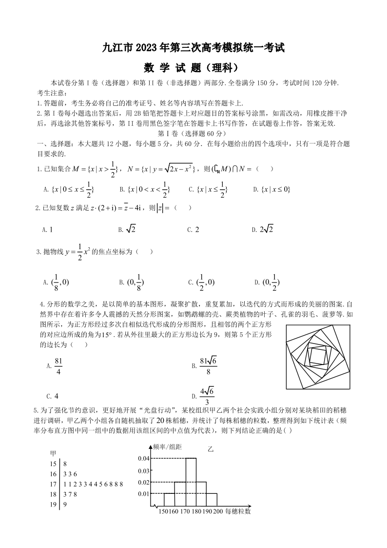 2023届江西省九江市高三第三次模拟考试 数学(理)