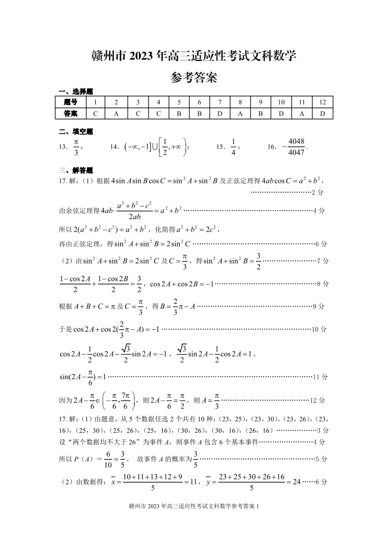 2023届江西省赣州市高三第二次模拟考试 文数答案