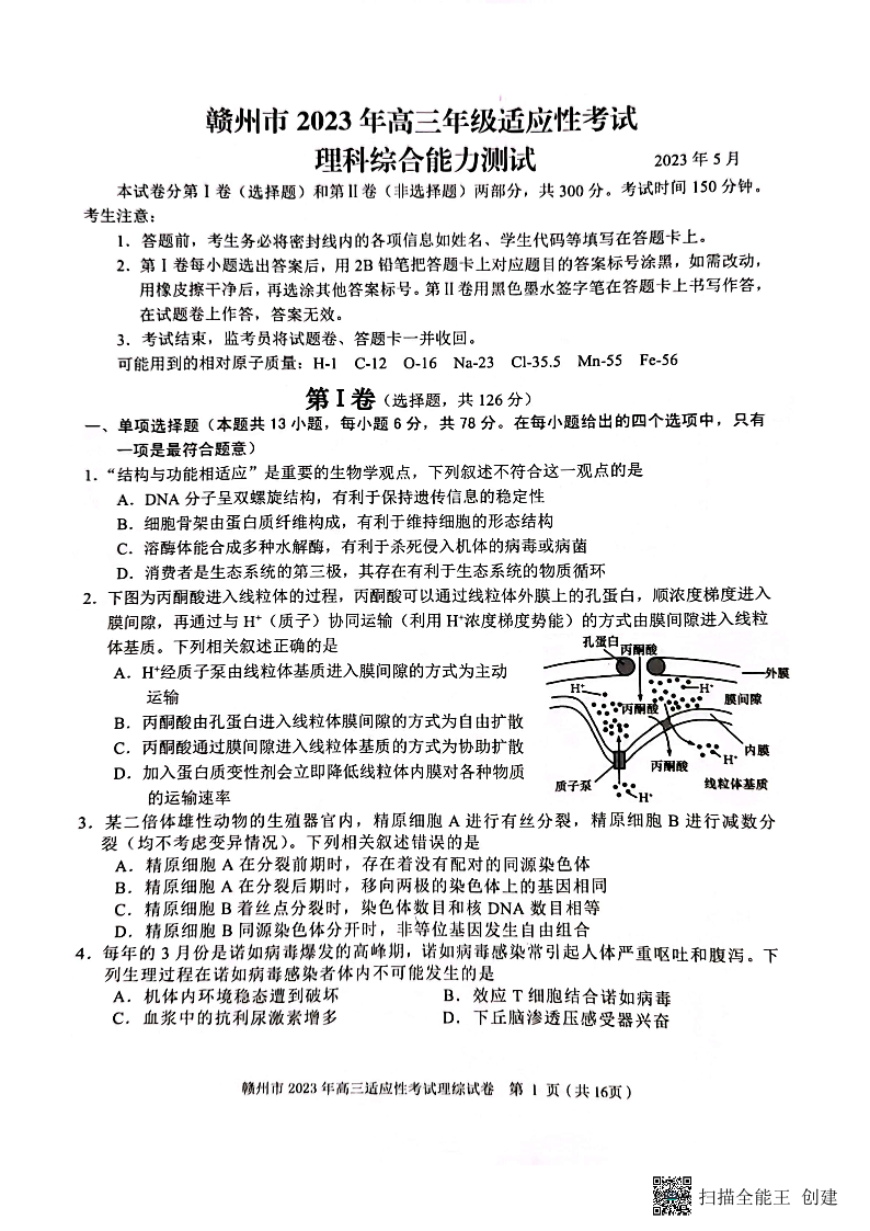 2023届江西省赣州市高三第二次模拟考试 理综