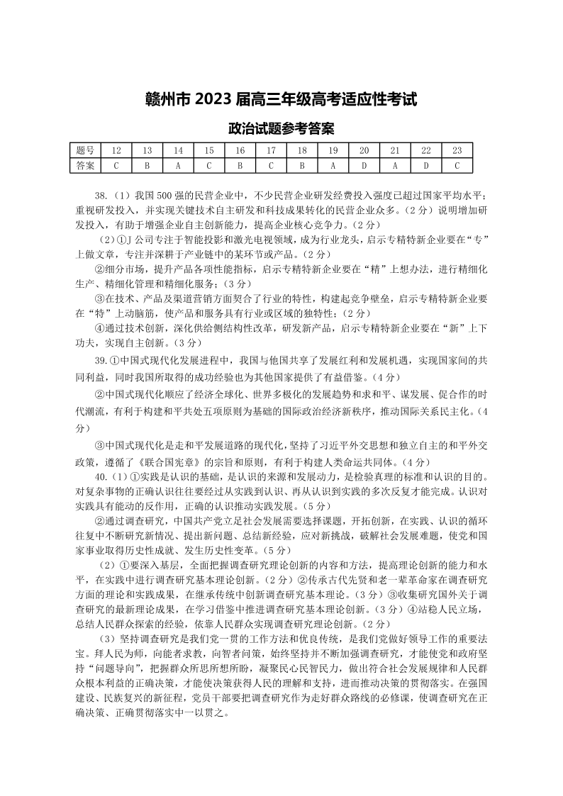2023届江西省赣州市高三第二次模拟考试 文综政治答案