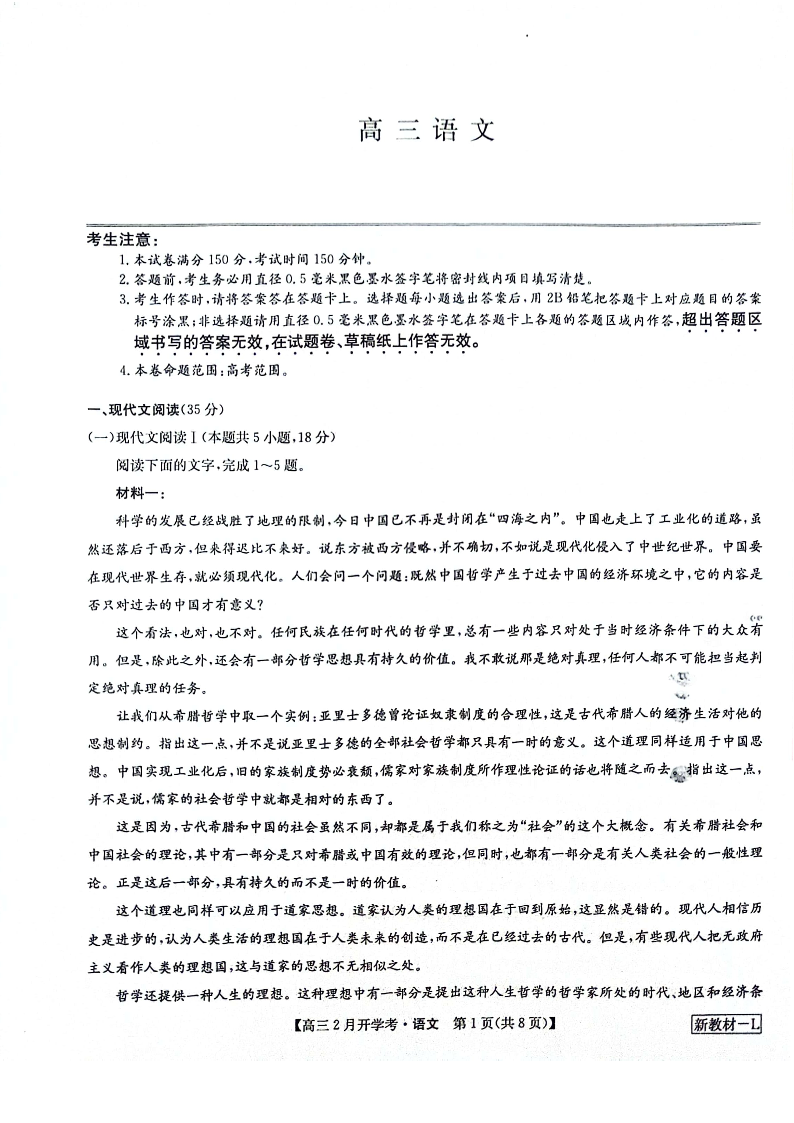 九师联盟2023-2024学年下学期高三2月开学考试 语文